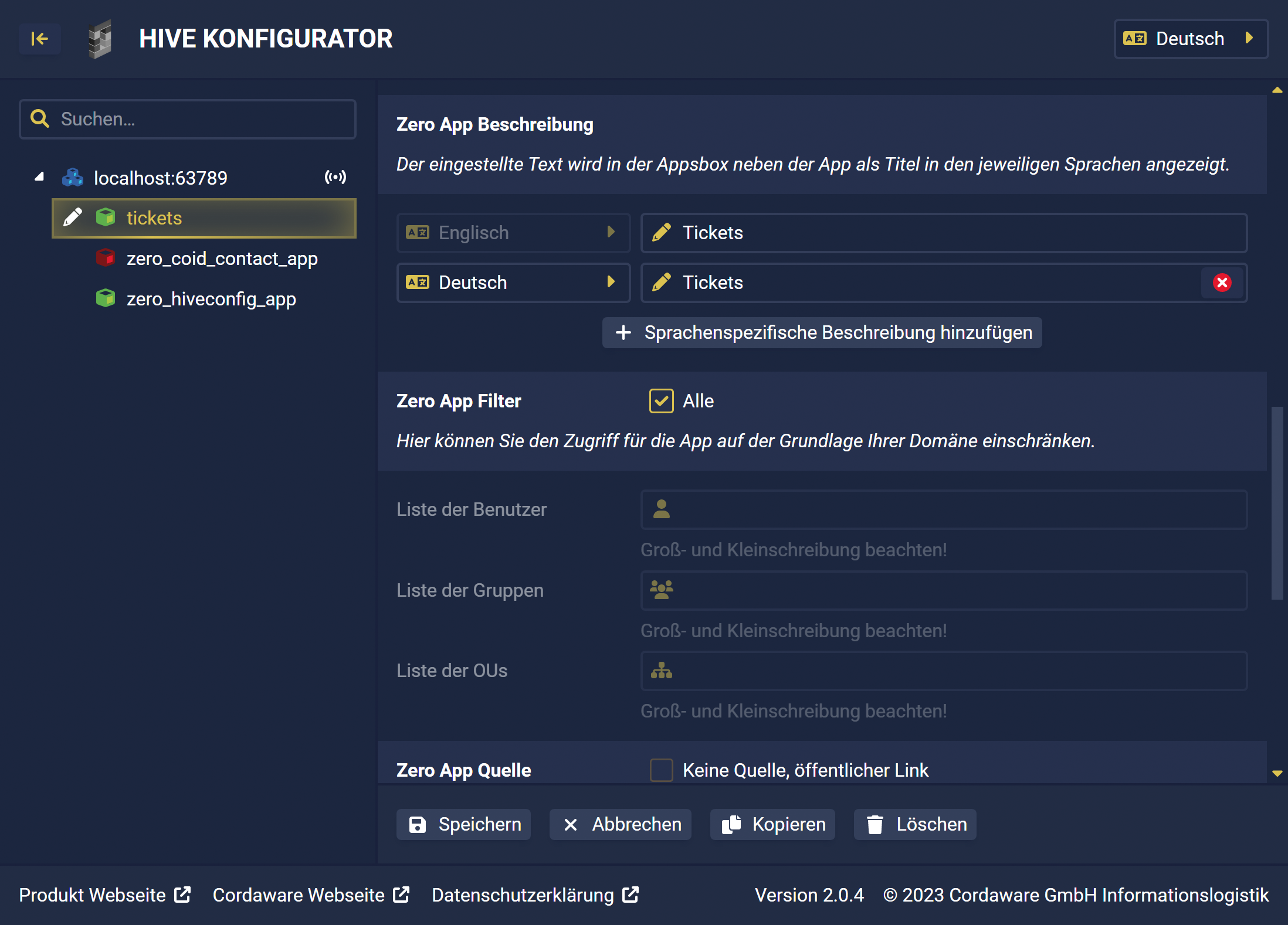 Im Menü auf der linken Seite kann nun eine App ausgewählt und bearbeitet werden. Für unser Beispiel wählen wir die App tickets aus.