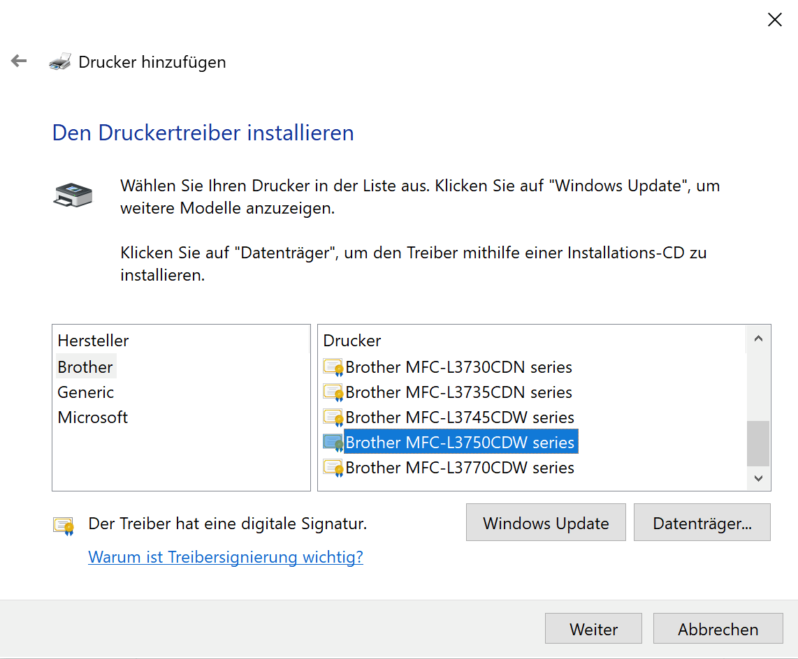 4.7. Zuletzt noch den Druckertreiber des Herstellers auswählen, ggf. über Datenträger suchen. Bitte beachten Sie, dass dieser zuvor installiert werden muss.