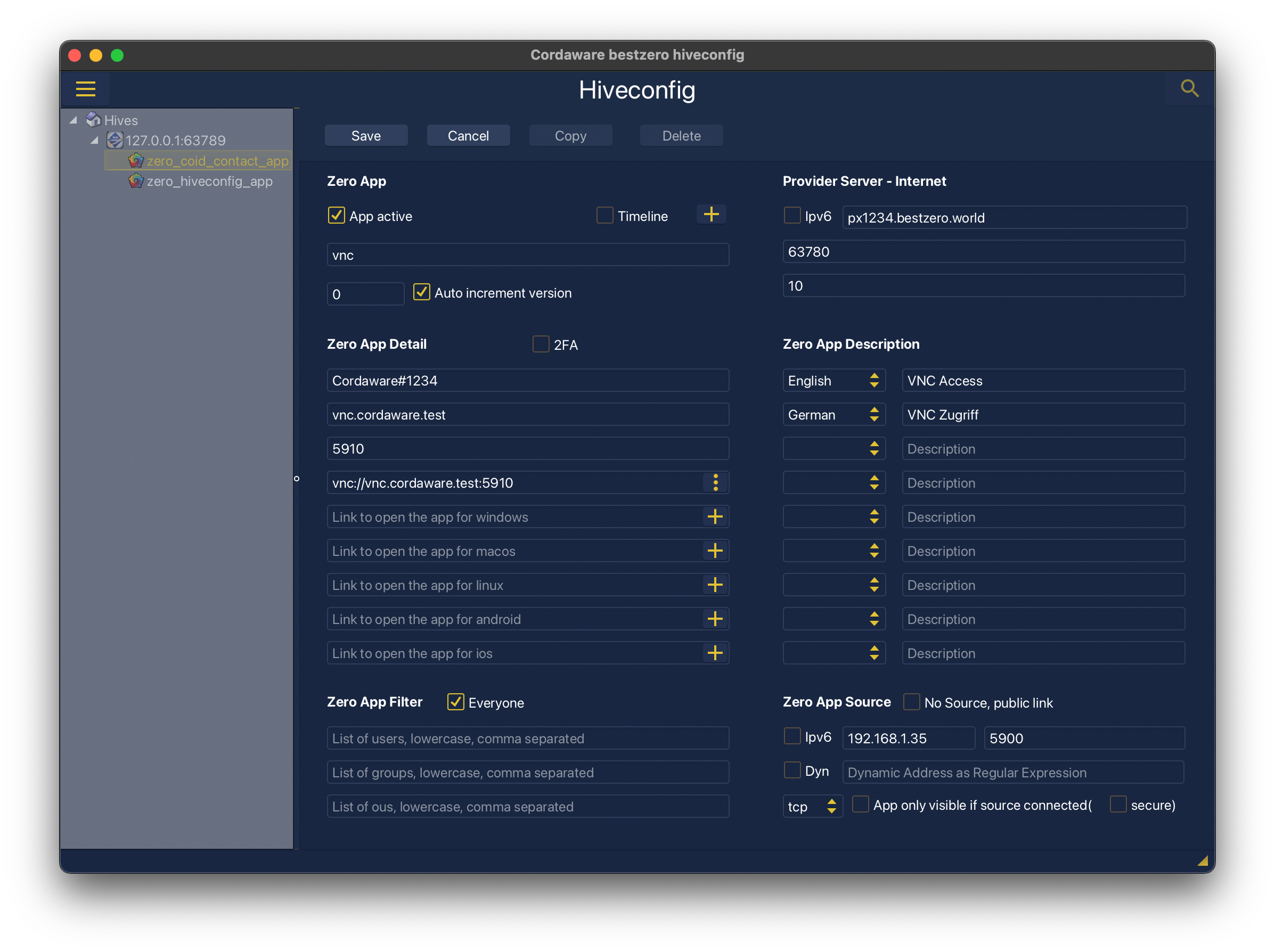 The address "vnc.cordaware.test" and the port "5910" can be replaced at will.