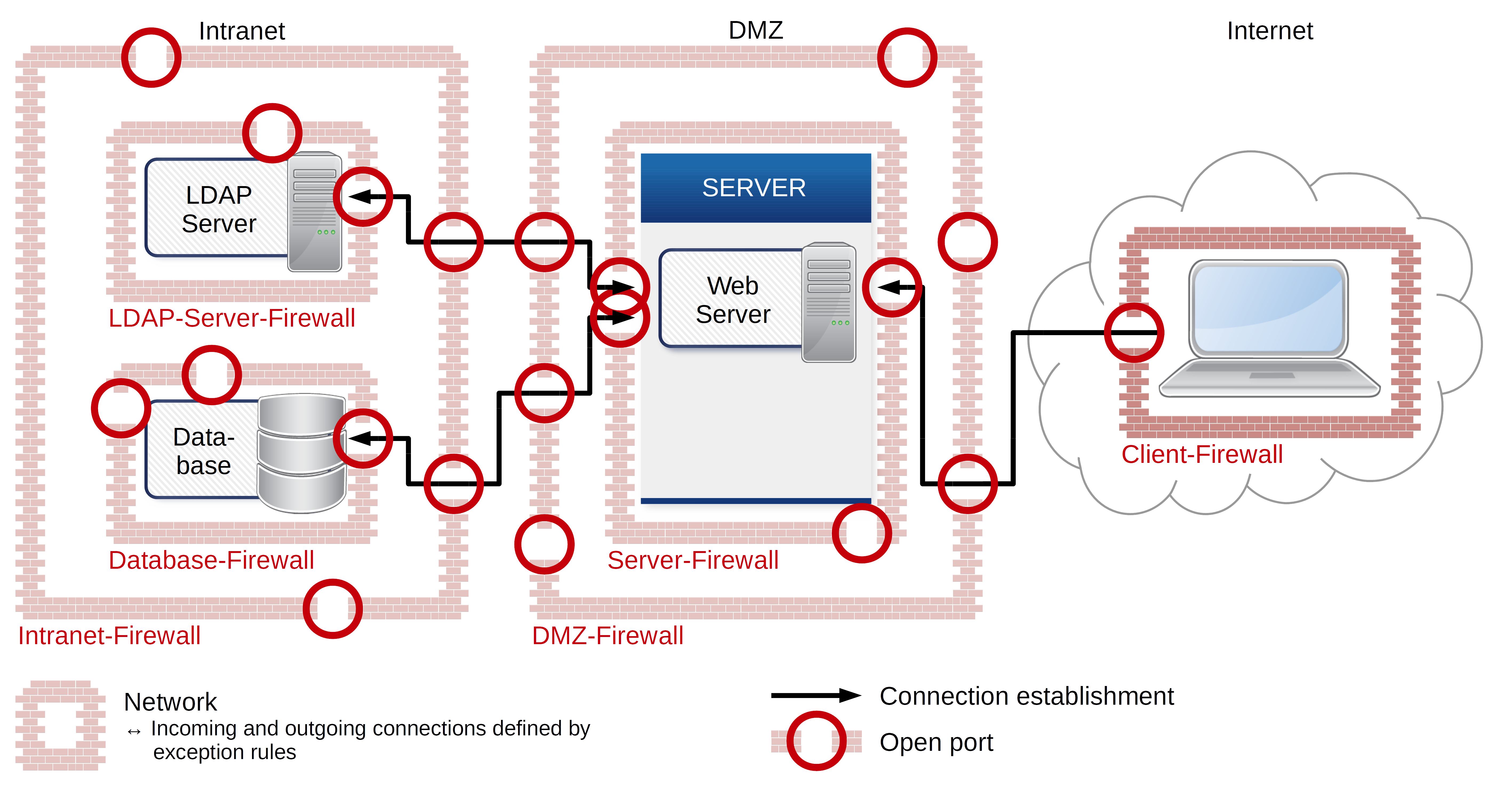 Because of this, connections are only established in the outward direction, which means that no exception rules have to be defined in the firewall anymore that enable an incoming connection from the internet or the in-between network into the internal network.