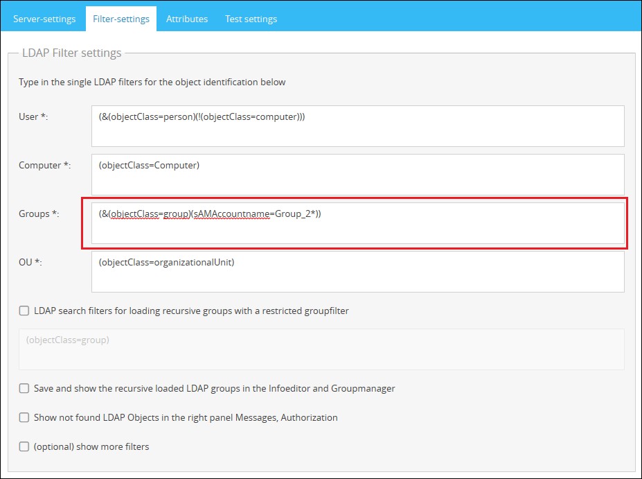 In this example we only want to use groups of our domain which start with "Group_2". In order to do so, the filter needs to be adjusted as follows: