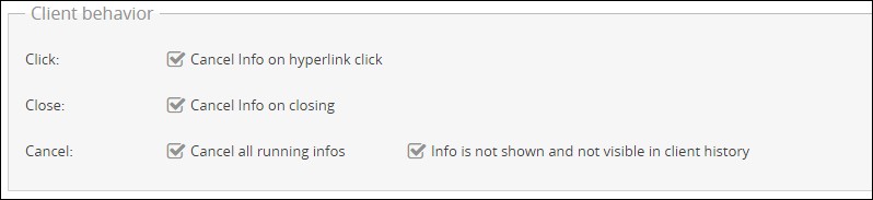 Cancels all running Infos on the client when the user closes the newsticker. However, the Info remains active on the server. An Info closed at the client may reappear if a new Info arrives and this option is not set.