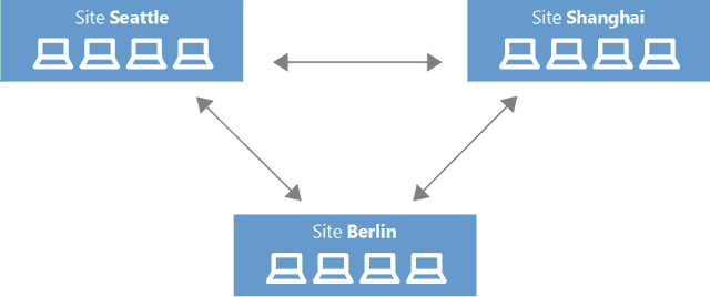 By building this cluster, all saved data such as Infos, Templates or Filters and any changes will be synchronized across all sites. For example, if a user creates a new Filter on the server located in Berlin, this Filter will also be accessible from the Shanghai and Seattle site. Additionally, every connected client to each site will be visible and addressable throughout all connected sites. For example, if a client is connected to the server in Berlin, this client will also be visible and addressable from both the Seattle and Shanghai site.