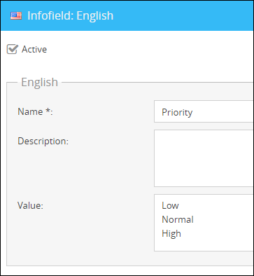 The following sections, German and English are used to define how the field will be displayed for each web interface lanuage. To provide the Infofield for the respective web interface check the box Active.