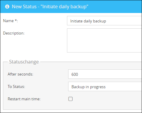 For the Statusinfo "Databackup", the status "Backup in progress", "Initiate daily backup" and "Initiate weekly backup". The status "Initiate daily backup" and "Initiate weekly backup" are supposed to switch to status "Backup in progress" ten minutes after activation. The status "Backup in progress" is supposed to be active for 60 minutes before the Statusinfo is reset.