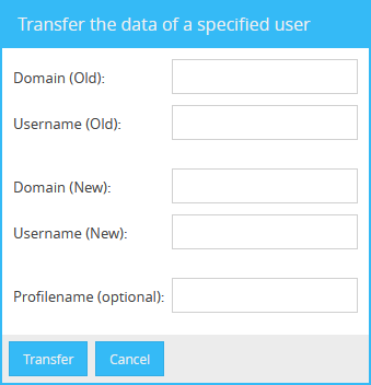 To do this, open the System (local) app and click on “Transfer the data of a specified user”. You will now see the following window. In this window, enter the domain (the name of the domain from the Domains app must be used) and the user name from which you want to move the data records. The fields are marked with (Old).
